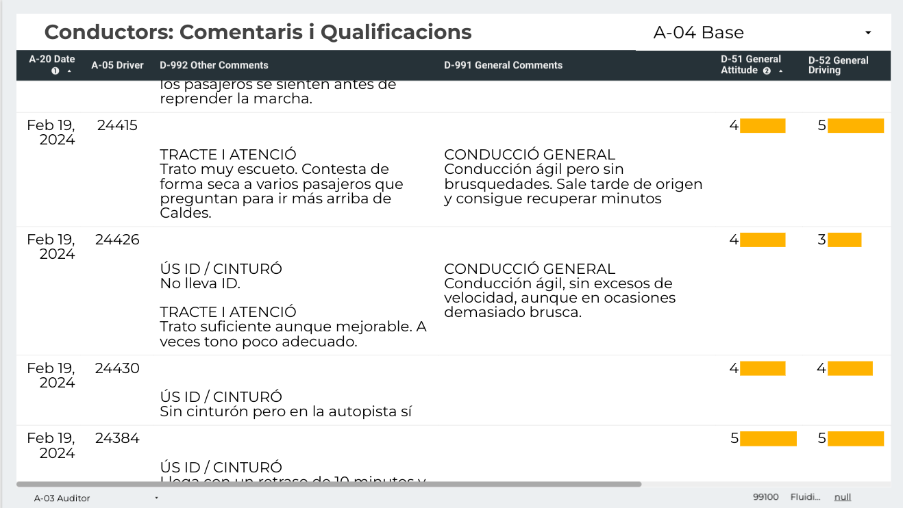 Accedeix als comentaris detallats sobre la conducció, i les incidències relacionades amb el manteniment i neteja dels vehicles i altres estadístiques.
